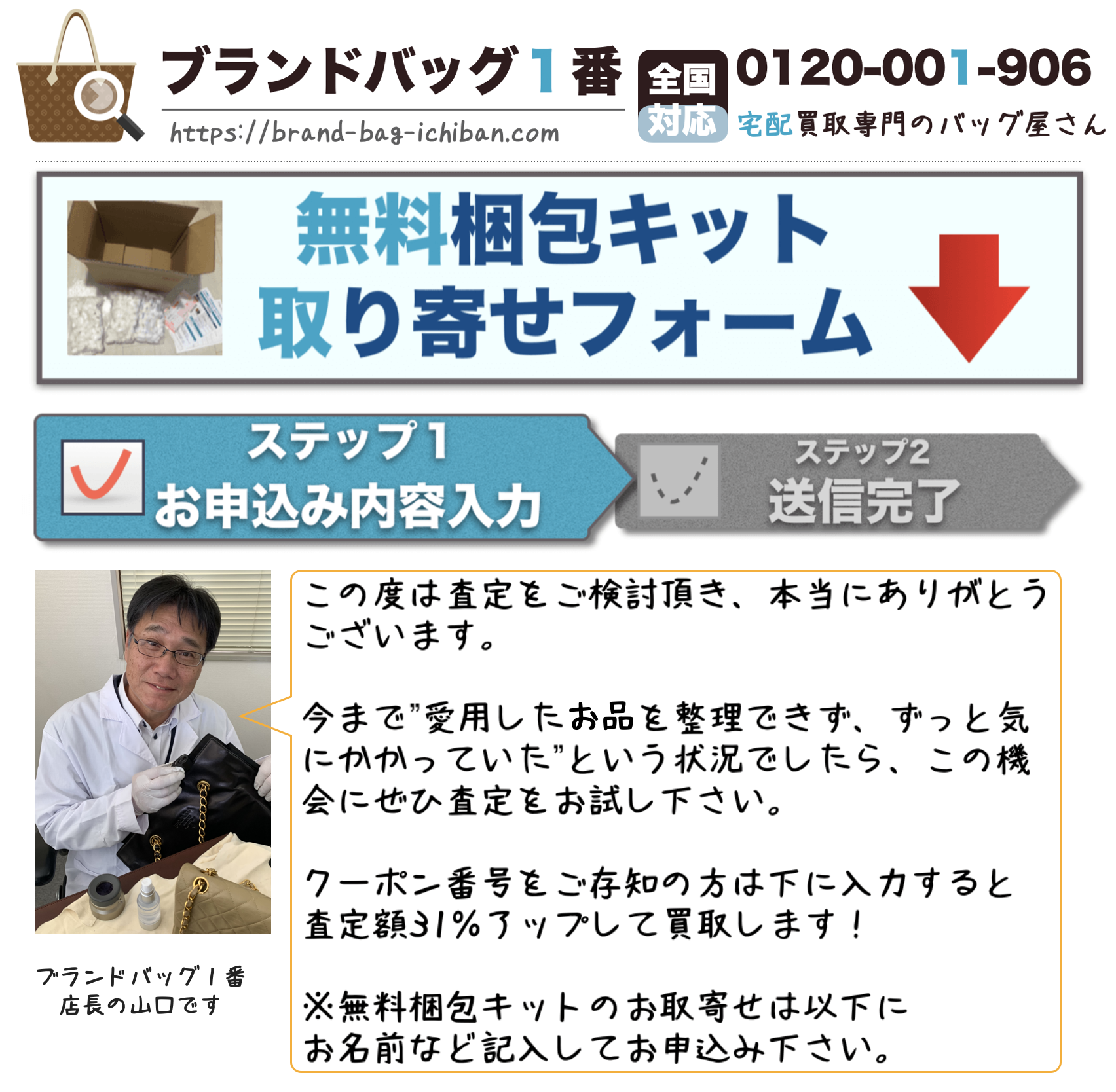 A:ダンボール箱と梱包用のプチプチ、買取依頼書、今後の流れの解説書、ヤマト着払い用送り状が入ったセットになります。